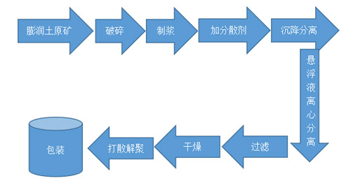 對于膨潤土原礦蒙脫石含量較低(30%-80%)的低品位膨潤土或含長石、石英的粒度教習(xí)的膨潤土,要想獲得更高的純度的膨潤土或蒙脫石,往往采用濕法提純方法。工藝流程如下: